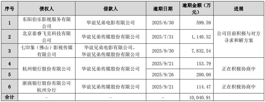 在华谊兄弟10月发布的公告中,北京泰瑞飞克科技有限公司作为债权人被列出。公告透露该债务的逾期时间是2025年7月31日,华谊兄弟正在积极与对方寻求解决方案。